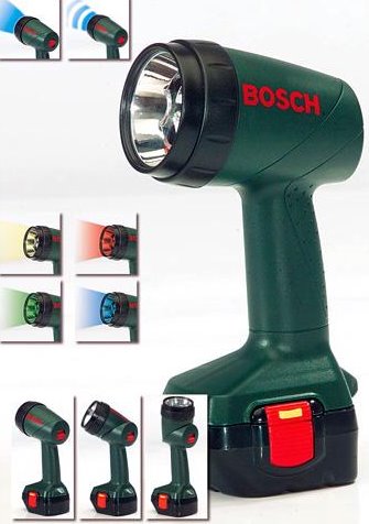 Svietidlo Bosch. Otáčaním sklíčka na baterke sa mení farba svetla. Baterka svieti bielo, modro, zeleno alebo červeno. Rozmer balenia 15,5x7x26,5 cm. Vhodné pre deti od 3 rokov.
