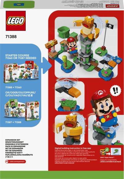 Doprajte deťom možnosť prežívať vo svete LEGO® Super Mario™ nové zábavné dobrodružstvá vďaka rozširujúcemu setu Boss Sumo Bro a padajúce veža (71388). Obsahuje vežu, ktorú môžu LEGO® Mario™ alebo LEGO® Luigi™ (figúrky nie sú súčasťou balenia) zboriť pomocou páčok v spodnú časť modelu. Veža je možné postaviť rôzne vysokú, a akonáhle Boss Sumo Bro padne, objaví sa akčná kocka Super Star. Sada obsahuje aj figúrku Crowbera. (Poznámka: Pre plnohodnotný interaktívny herný zážitok je potrebné vlastniť štartovací set 71360 alebo 71387.)
