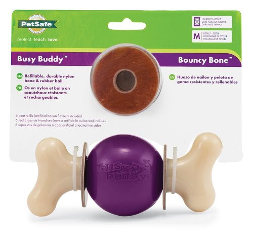 Kosť je vyrobená z odolného materiálu. Možno ju rozskrutkovať a nasadiť maškrty-plátky, ktoré dokážu psa zabaviť na dlhú dobu. Hračky Busy Buddy® s maškrtou v tvare krúžku pomáhajú hravou formou presmerovať pozornosť psíka od poškodzovania nábytku či obuvi k hračkám Busy Buddy®.