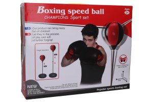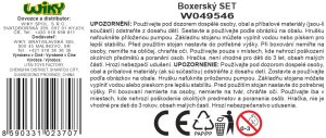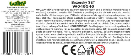 Box set boxovacia hruška a rukavice. Rozmery, nastaviteľná výška 69x109 cm, rozmery základne 33x33 cm, priemer hrušky 22 cm. Schéma zostavenia na obale. Obsahuje rukavice, sadu na montáž a pumpičku.