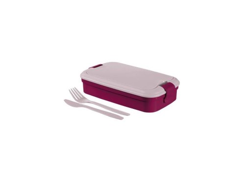 Cestovný plastový desiatový box s vidličkou a nožom. V boxe sa nachádza špeciálna priehradka, ktorú je možné ľahko vybrať.