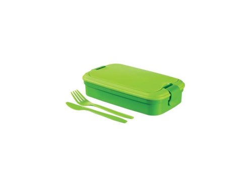 Cestovný plastový desiatový box s vidličkou a nožom. V boxe sa nachádza špeciálna priehradka, ktorú je možné ľahko vybrať.