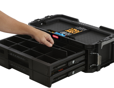 Box Keter Connect využijete na uskladnenie pracovných pomôcok. Uschovajte v ňom malé nástroje, diely a ďalšie remeselné potreby. Vďaka 2 zásuvkám ich rýchlo nájdete a máte ich po ruke, kedykoľvek potrebujete. Úložný priestor si prispôsobíte pomocou vyberateľných prepážok , ktorými oddelíte skrutky od matíc a iného drobné náčinie.