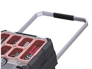Kovová rukoväť s mäkčenou časťou pre dlaň a gumové kolieska dotvárajú súhru všetkých materiálov. Súčasťou je aj systém centrálneho zamykania, ktorý chráni obsah za všetkých okolností. Do posuvnej časti uložíte 6 odnímateľných červených priehradok.
