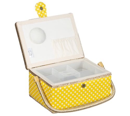 • Box na šijacie potreby s uzatváraním na patent. Na vnútornej strane veka je malé praktické vrecko a „piškót“ na zapichovanie špendlíkov a ihiel. Veľké madlo uľahčuje manipuláciu. Vnútorná látka boxu je vo svetlo béžovej farbe. Vonkajšie rozmery (merané bez madla): 24 x 17,5 cm, výška 13 cm.