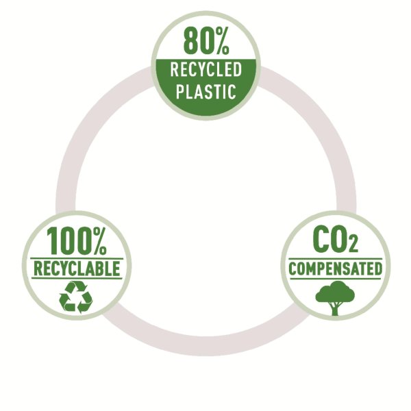 • Vyrobené z 80% recyklovaného plastu, neutrálna uhlíková stopa, 100% recyklovateľné as ekologickou certifikáciou Blue Angel
