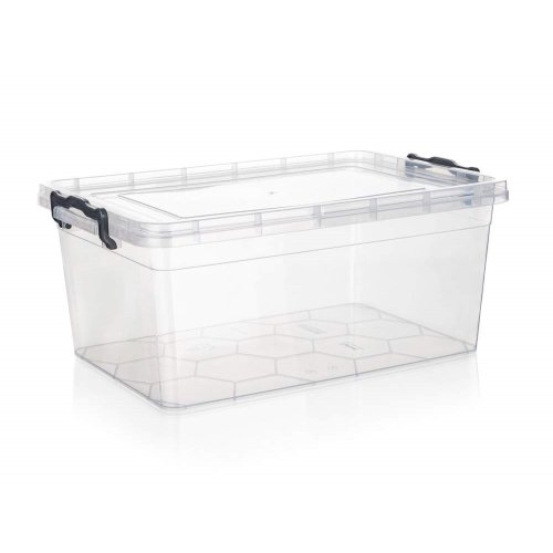 objem: 14 l rozmery: 42 x 27 x 18 cm materiál: plast farba: transparentný box, šedé klipy