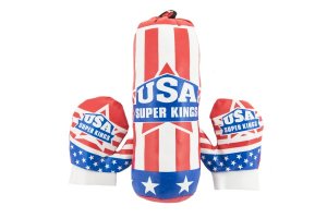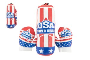 Detské boxovacie vrece a rukavice s motívom americkej vlajky. Veľkosť 10x33 cm. Vhodné od 3 rokov.