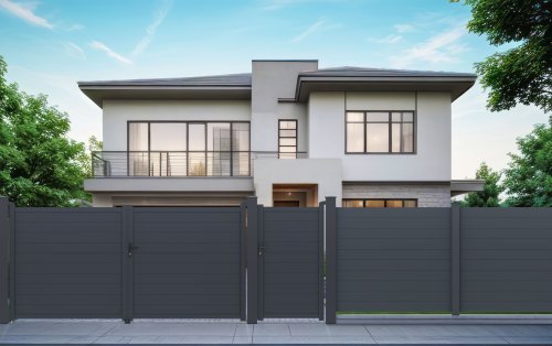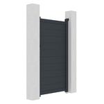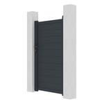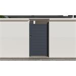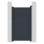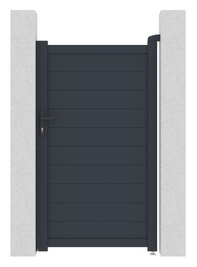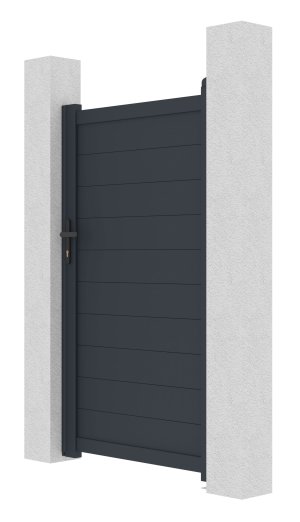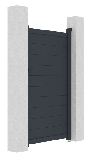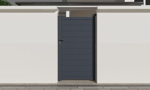 Výplň s horizontálne uloženými lamelami v atraktívnom grafitovom prevedení kombinuje dostatok súkromia s moderným dizajnom, takže bránka s otváraním dovnútra pristane každému typu oplotené stavby.