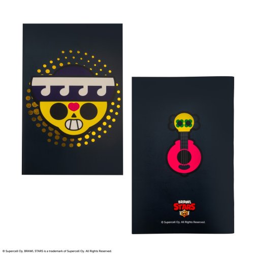 Prednú stranu obalu zdobí výrazná a farebná potlač ikonickej postavičky Poco, ktorá je charakteristická svojou žltou lebkou s červeným srdiečkom namiesto nosa a fialovým klobúkom. Tento motív je doplnený o zlaté bodky okolo lebky, ktoré dodávajú designu trblietavý a dynamický efekt. Na zadnej strane je potom štylizovaná ružová gitara s lebkou, ktorá dopĺňa tematiku Brawl Stars a podčiarkuje herný štýl celého výrobku. Logo Brawl Stars je decentne umiestnené na spodnom okraji zadnej strany obalu.