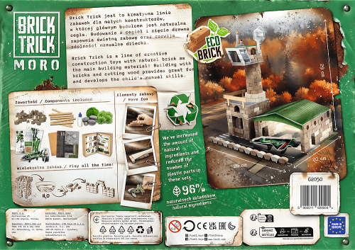 Staňte sa staviteľom a vybudujte zo skutočných hlinených tehál a dreva svoje vlastné vojenské letisko! Skladajte tehlu za tehlou, režte a lepte dosky, postupujte od základov až po dokončenú budovu a nakoniec svoj výtvor ozdobte priloženými dekoráciami. Stavajte krok za krokom podľa návodu alebo nájdite a zrealizujte svoje vlastné riešenie. Oživte svoju dokončenú stavbu papierovými figúrkami. Pokiaľ spojíte niekoľko sád TREFL Brick Trick, môžete vytvoriť malebnú dedinku, moderné mesto alebo stredovekú osadu. Stavebnicu je možné používať opakovane (lepidlo je rozpustiteľné vodou). Balenie obsahuje: - viac ako 360 prírodných hlinených tehličiek - drevené dosky - lepidlo - dekoračné doplnky - základovú dosku - obrázkový návod Stavebnice Brick Trick od výrobcu TREFL zlepšujú manuálne zručnosti, rozvíjajú predstavivosť a podporujú sústredenie. Vhodné pre deti od 6 rokov. Vyrobené v EÚ.