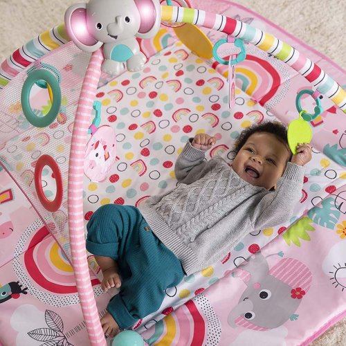 Keď dieťa vyrastie, môže si samo precvičovať motorické zručnosti púšťaním loptičiek zo striešky alebo kotúľaním či podávaním loptičiek sem a tam! Pre menšie bábätká sa hracia deka rozloží celá, kde dieťatko môže stráviť čas na chrbátiku a hrať sa s hračkami na hrazdičke alebo sa s nimi zahrať na brušku pri podpore s vankúšikom, ktorý je tiež súčasťou. Veselý sloník svieti a hrá hudbu viac ako 20 minút a samozrejme si ho môžete zobrať so sebou aj na cesty. Pozornosť dieťatka samozrejme upútajú aj ďalšie hračky y ako prevliekanka s korálkami, hračka jednorožca, bezpečné zrkadlo, farebné karty, hryzátko v tvare listu a hrkálka s korálkami. Hurá za zábavou!