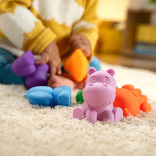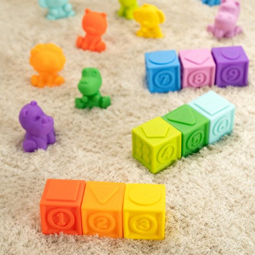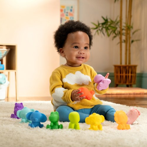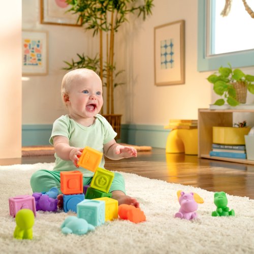 Zažite dúhovú zábavu počas kúpeľa, hier alebo na cestách! Táto bohatá sada obsahuje 9 tropických zvieratiek a 9 farebných kociek, ktoré bábätku otvárajú svet plný objavov, učenia a fantázie. Tropické zvieratká prinesú každodenné safari do kúpeľne či herničky, zatiaľ čo farebné kocky pomôžu dieťatku pri učení počítania a stohovania. Vďaka rôznym číslam, zvieratkám a farbám si dieťa rozvíja zmysly, jemnú motoriku aj predstavivosť, a zároveň si buduje vzťah s rodičmi pri spoločnej hre. Všetky diely sa jednoducho vyčistia – po kúpeli len vyžmýkajte vodu a utrite vlhkou handričkou.
