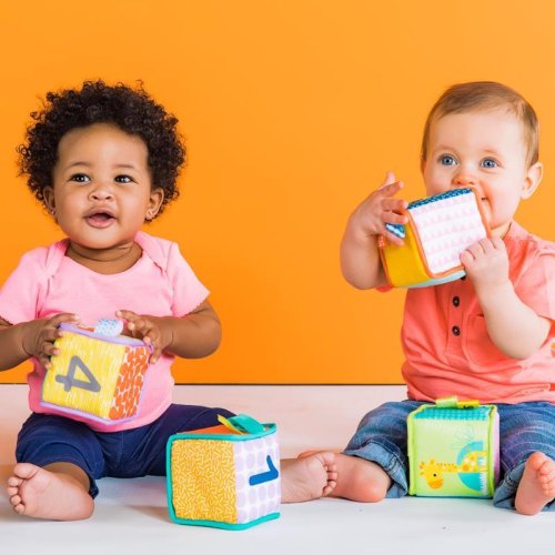 Skladať, stavať a skúmať s týmito mäkkými látkovými kockami! - 4 mäkké kocky s 3D funkciou, vráskami, saténové tagy, hrkajúce, cinkajúce - Každá kocka má číslo, písmeno, roztomilý charakter a farebný …