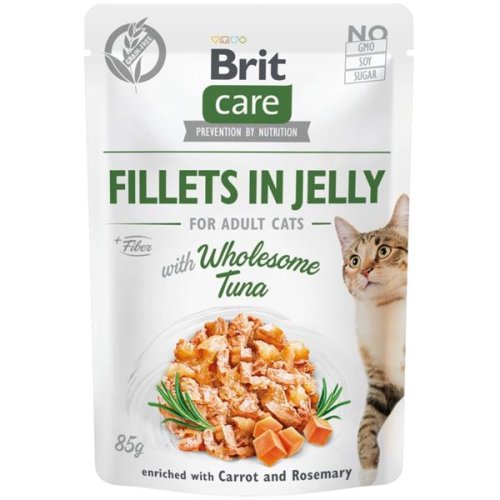 Filetky Brit Care Cat obsahujú mäsové kúsky v želé. Mäsové kúsky sú obohatené o mrkvu a rozmarín. Kompletné superprémiové krmivo je špeciálne vyvinuté pre dospelé mačky a je bezobilné. Mačacie jedálniček by mal byť pestrý, chutný a zdraviu prospešný. Lahodné vrecko Brit Care Wholesome Tuna obsahuje mäso z tuniaka (8 %) a kurčaťa (62 %). Je vhodná ako kompletné krmivo alebo ako doplnok k suchému krmivu (zvýšenie rozmanitosti a chuti stravy). Filetované kúsky v jemnom želé sú ideálne najmä pre veľmi vyberavé mačky alebo mačky s problematickým príjmom krmiva. Vďaka pridaným zložkám (mrkva, rozmarín) podporuje krmivo zdravé trávenie.