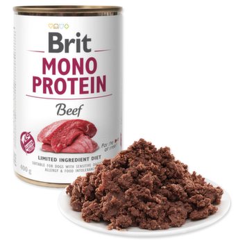 Monoproteín – konzerva obsahuje iba mäso a vnútornosti z jedného živočíšneho zdroja. Nájdenie toho, čo škodí psom s citlivým zažívaním, intoleranciou alebo s alergiou, môže byť beh na dlhú trať, v ktorom nám môžu pomôcť konzervy s jedným druhom proteínu. Vylučovacou metódou je možné ľahko vyradiť všetko škodlivé. Pretože niektorí psi s citlivým zažívaním zle trávia väčšie kúsky mäsa či vnútorností, majú konzervy Brit Monoproteín konzistenciu jemného paté – lepšie sa trávia a ľahko ich prijímajú aj psí seniori, ktorí majú problém so zubami. Hlavné prednosti: