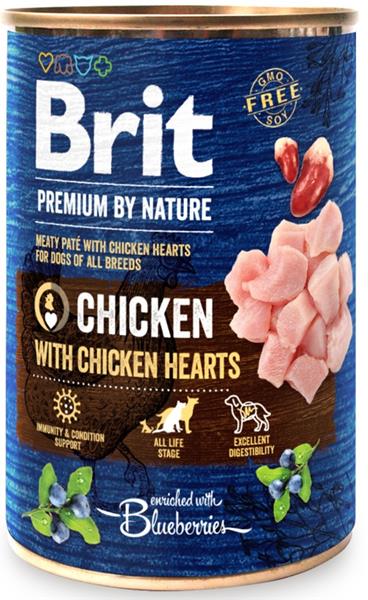 kura s kuracími srdiečkami (kurča 58 %, kurací vývar 35,5 %, kuracie srdce 4 %), pridaný lososový olej – zdroj omega-3 mastných kyselín, obohatené o čučoriedky na podporu imunity (čučoriedky 1 %).