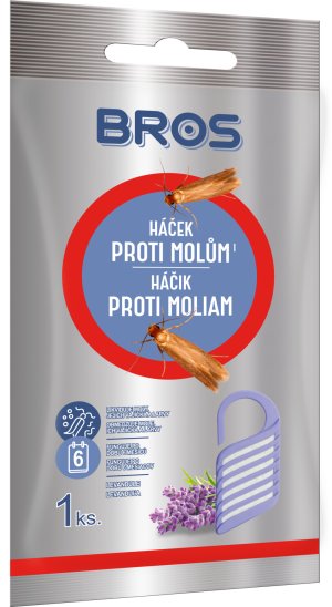 Bros závesný háčik proti šatňovým mólam účinne chráni odevy, látky a kožuchy pred poškodením moľami. Záves je možné používať v šatníkoch, skriniach, zásuvkách, kufroch a pod. Záves dáva odevom príjemnú levanduľovú vôňu. Prípravok pôsobí ihneď po vybratí z obalu, je účinný po dobu 3 mesiacov.