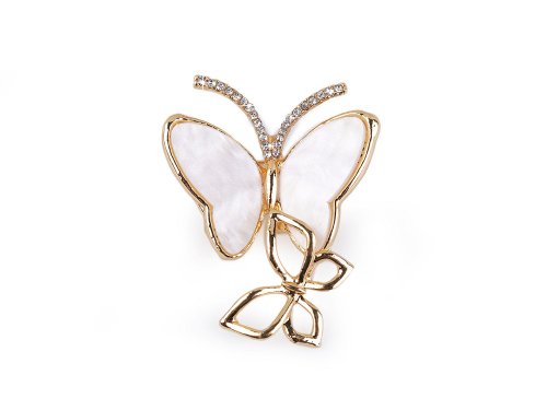 Brošňa dvoch motýľov je elegantným módnym doplnkom. Väčší motýľ má krídla ozdobené imitáciou perlete, tykadlá má vysadené drobnými brúsenými kamienkami, ktoré sa krásne trblietajú. Zapína sa pomocou brošňového špendlíka. Brošňa môžete nosiť nielen na odevoch, ale hodí sa aj na ozdobenie klobúkov, tašky či zopnutie šatky. Je na plastovej karte, ktorá sa dá zavesiť na predajný stojan.
