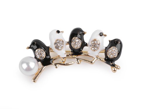 Kovová brošňa vtáčikov na vetvičke s perlou je veľmi elegantná, môžete ju využiť na bežné nosenie aj na spoločenské udalosti - návštevy divadiel, oslavy a pod. Je ozdobená brúsenými kamienkami, vďaka ktorým sa nádherne trblietajú. Z rubu má brošňa zatvárací špendlík. Môžete ju nosiť nielen na odevoch, hodí sa aj na ozdobenie klobúkov, tašky či zopnutie šatky. Brošňa je na plastovej karte, ktorú je možné zavesiť na predajné stojany. [Brož č.2 nemá perlu ani brúsené kamienky.]