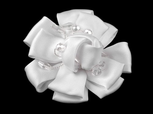 Textilná brošňa kvetu je ozdobená brúsenými korálkami, vďaka ktorým sa jemne trblietajú. Kvet je bohato vyskladaný zo saténu, pôsobí elegantným dojmom. Vzadu má brošňový špendlík, kvetom si môžete ozdobiť šaty, blúzku, sako, klobúk aj kabelku.