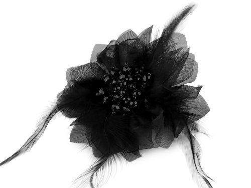 Veľká elegantná brošňa je vyrobená z jemného šifónu, ktorý pripomína kvetinu, a jej stred je zdobený perím a trblietavými brúsenými korálkami, ktoré jej dodávajú luxusný vzhľad.
