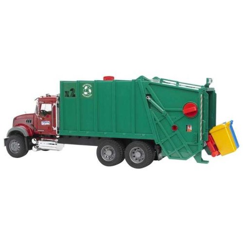 Bruder Nákladné auto MACK Granit smetiarsky zelený MACK Granite je model amerického nákladného auta prepracovaného do najmenších detailov. Okná kabíny sú vyrobené z priehľadného vysoko kvalitného polykarbonátu. Dvere kabíny je možné otvoriť, vyklápacia kapota umožňuje pohľad do motora, vozidlo má sklápacie spätné zrkadlá a profilované pneumatiky. Popolnice sa vyprázdňujú pomocou plne funkčného výťahu, lis na odpadky je rovnako ako v reálnom vozidle aj plne funkčný. Lis prepravuje odpadky do zadnej časti vozidla a po naplnení auta môže byť zadná časť otvorená a auto vyprázdnené. Vyrobené v Nemecku, z kvalitných materiálov. Hlavné vlastnosti: detailné modelotvárateľné dvere kabíny, vyklápacia kapota, sklápacie spätné zrkadláplne funkčný výťah aj lis na odpadkysúčasťou balenia sú 2 popolnicevyrobené v Nemecku