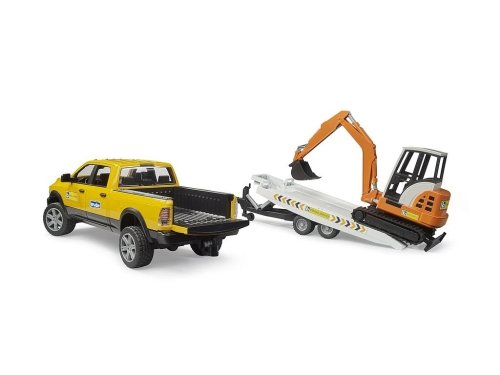 Model auta RAM s prívesom a minirýpadlom je vernou kópiou skutočného vozidla RAM, ktoré je robustné a vyznačuje sa veľkou ťažnou silou. Súčasťou sady je príves, ktorý umožňuje bezpečný transport minirýpadlá. Plošina je naklápacia, čo uľahčuje nakladanie a vykladanie, a oj je vybavená stabilizačnou podperou pre bezpečné parkovanie. Kabína minirýpadlá sa otáča o 360 °, rýpadlo má odnímateľnú lyžicou a nastaviteľnú radlicu. Vďaka gumovým pásom sa zvládne pohybovať aj v náročnom teréne. Model má odpružené nápravy, vďaka nim zvládne aj jazdu v teréne a predĺžený nadstavec volantu uľahčuje jeho ovládanie. Kabína je dostatočne veľká až pre 4 figúrky bworld a všetky dvere sú otvárateľné. Na zadnej korbe sa dá prepravovať menší náklad a zadné dvere sa dajú otvoriť pre jeho ľahké naloženie. Vyrobené precízne z kvalitných materiálov. Vytvorte realistické stavenisko za použitia ďalších modelov Bruder, ako je figúrka stavebného robotníka (BR60020), minibager (BR2456) alebo dopravné značky (BR62007). Vyrobené precízne z kvalitných materiálov. Hlavné vlastnosti: mierka 1 : 16riadenie pomocou predĺženého volantu otváracie dvere kabínyotváracie dvere korbyodnímateľné ťažné zariadenieodpružené nápravykompatibilné s figúrkami bworldvyrobené v Nemecku z vysoko kvalitných materiálov