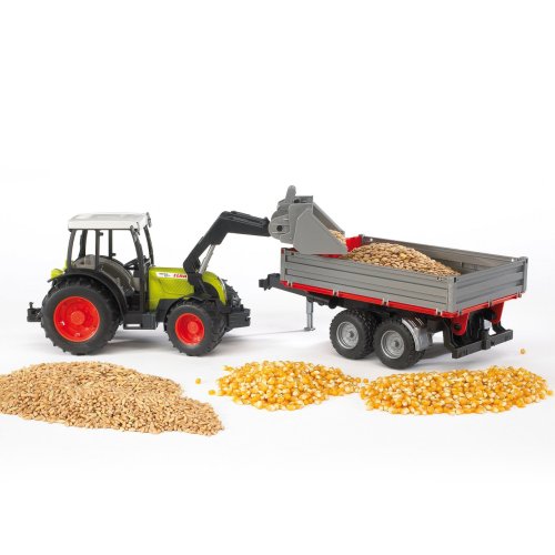 Tento model Class zo série Nectis s prívesom a predným nakladačom je nepostradelným pomocníkom najmä na poli. Vďaka pevným profilovým pneumatikám je traktor ľahko riaditeľný a manévrovateľný aj v náročnejších pôdnych podmienkach. Tento model je vybavený plne funkčným čelným nakladačom, ktorý je možné ľahko odňať, má otvárateľný motorový priestor, zasklenú kabínu, funkčné riadenie - súčasťou je druhý volant s dlhším ramenom, ktorý sa zasunie do existujúceho volantu v kabíne strešným výsuvným otvorom a tým veľmi uľahčí ovládanie stroja . Súčasťou tohto setu je Bruder sklápací červený príves, ktorý je skutočne vernou kópiou dvojnápravového prívesu. Má otváracie postranné aj zadné bočnice a sklopnú ložnú plochu. Vyrobené v Nemecku, z kvalitných materiálov. Hlavné vlastnosti: pevné profilované pneumatiky plne funkčný čelný nakladač
