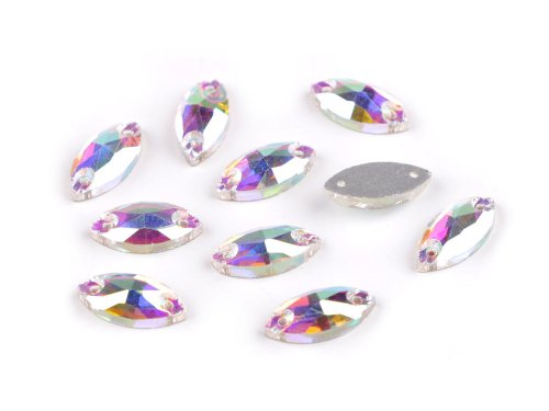 Sklenené kamienky v tvare navety majú precízny výbrus, vďaka ktorému sa efektne trblietajú. V každom kamienku sú dva otvory, ktoré umožňujú ľahké našívanie. [Na rubovej strane sú opatrené krycou farbou, ktorá zabraňuje sfarbeniu podľa priloženého podkladu.] Oceníte ich pri výrobe šitých šperkov alebo zdobení odevov. Kamienky oslnivo vyniknú na spoločenských šatách, blúzkach a doplnkoch, ako sú kabelky, listové kabelky, klobúky a pod.