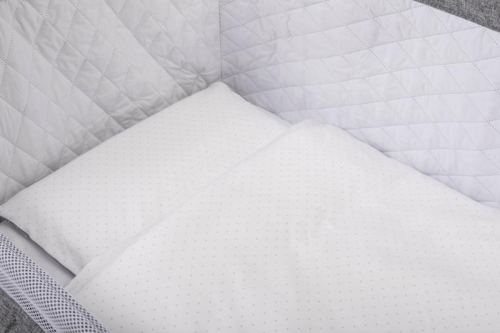 vhodné do kolísok a malých postieľok 90x50x33 cm vankúš 40x30 cm (výplň: polyester) obliečka na vankúš 40x30 cm (95% bavlna a 5% lycra) prikrývka 92x72 cm (polyester) obliečka na prikrývku 95 prestieradlo s gumou 84x46x6 cm (100% bavlna) pranie pri max 30°C
