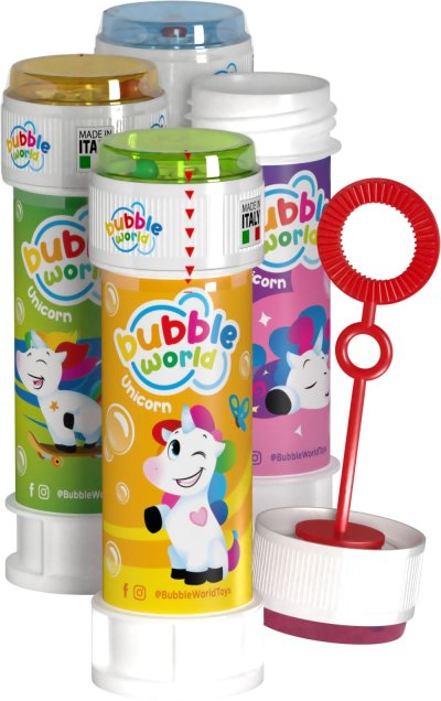 Bublifuk jednorožec s obsahom 60 ml. Súčasťou viečka je hra a fúkatko. Je možné zakúpiť aj ako celý display, kde je 36ks.