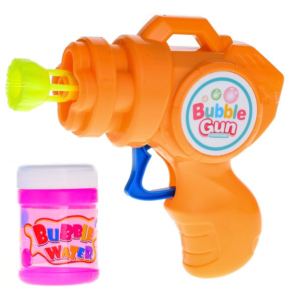 Bublifukovač pištole 13 cm na zotrvačník s náplňou 50 ml - mix farieb (oranžová, modrá, červená)