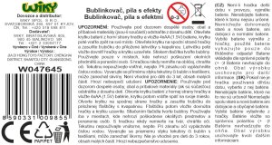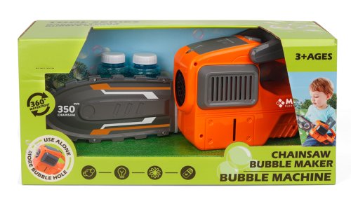 Bublinkovač motorová píla. Vydáva svetelné efekty. Veľkosť 35 cm. Aktivácia tlačidlom u rukoväte. Presné rozmery 35x9,5x18,6 cm. Batérie 4xAA, nie sú súčasťou balenia.