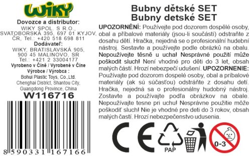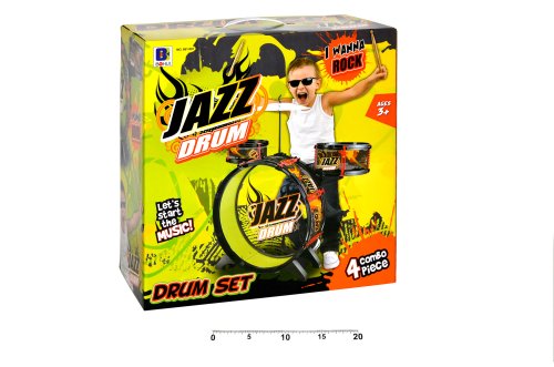 Súprava troch bubnov vrátane basového kopáka s nožným pedálom a kovovým cinelom.
