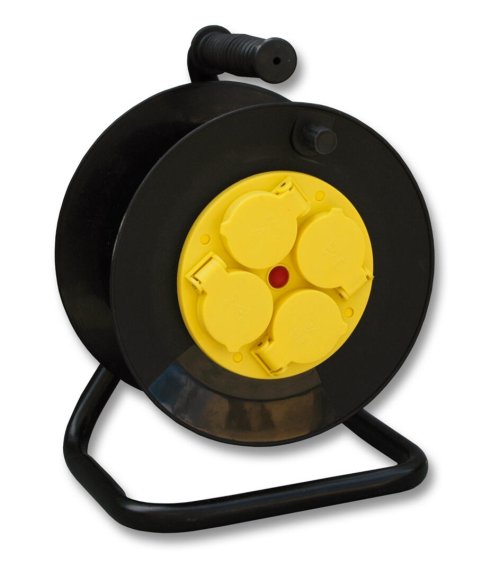 Čierny predlžovací kábel na navinovacom bubne pre vnútorné aj vonkajšie použitie so zvýšenou ochranou IP. Disponuje 4 zásuvkami, tepelnou poistkou, detskými clonkami a káblom s prierezom 1,5 mm2. Zásuvky a zástrčka sú vyrobené z plastu, izolácia je gumová.