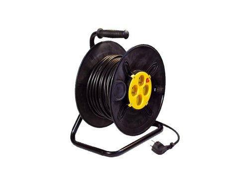 Čierny predlžovací kábel na navinovacom bubne pre vnútorné použitie. Disponuje 4 zásuvkami, tepelnou poistkou a káblom s prierezom 1,5 mm2. Zásuvky a zástrčka sú vyrobené z plastu, izolácia z PVC.