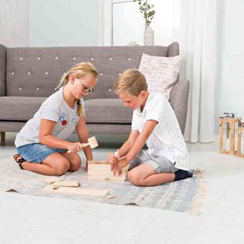 Balenie obsahuje aj ilustrovaný návod na zostavenie a drevené kladivko.