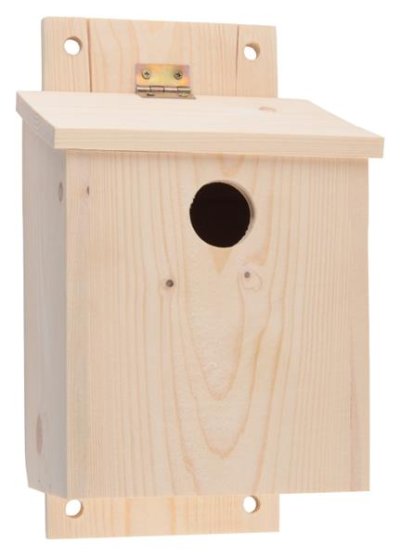 Vonkajšia drevená búdka s odklápacou strechou je vhodná na hniezdenie malých druhov sýkor, ako je modrinka, uholníček, parukárka. Vletový otvor s priemerom 2,7 cm. Búdka pre vtáky je vyrobená z prírodného dreva, ktoré nie je nijako napustené ani natreté. Rozmery: 12 x 12 x 22 cm
