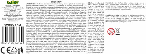 Bugina 590 RC na diaľkové ovládanie. Rozmery 33x22x14,5 cm. Frekvencia 2.4GHz. Batériový pack 3.7V 800mAh do auta súčasťou, 2xAA do ovládača nie sú súčasťou. USB kábel súčasťou. Prepínač ON/OFF na spodnej strane auta.
