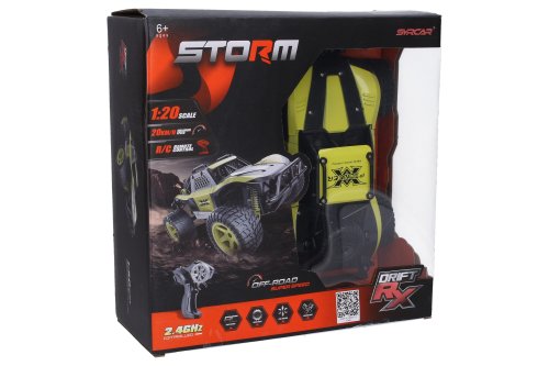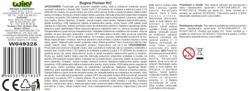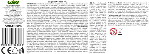 Bugina Pioneer RC na diaľkové ovládanie. Rozmery 24x16x11 cm. Frekvencia 2.4GHz. Pištoľový ovládač. Rýchlosť 20 km/h. Batériový pack 3.7V Li-ion 500mAh do buginy súčastí, 2xAA do ovládača nie sú súčasťou. Prepínač ON/OFF na spodnej strane buginy a na ovládači.