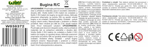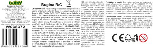 Bugina RC na diaľkové ovládanie. Rozmery 26,3x12,5x7,5 cm. Rýchlosť 25 km/h. Frekvencia 27 MHz. Pištoľový ovládač. Svetelné efekty. 5xAA batérie do auta, 2xAA do ovládača nie sú súčasťou. Prepínač ON/OFF na spodnej strane buginy, tlačidlo ON/OFF na ovládači.