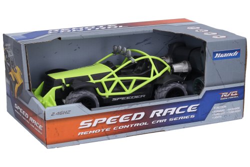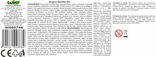 Bugina Speeder RC na diaľkové ovládanie. Veľkosť 22 cm. Frekvencia 2.4GHz. Pištoľový ovládač. Vydáva svetelné efekty. 4xAA batérie do auta, 2xAA do ovládača nie sú súčasťou. Prepínač ON/OFF na spodnej strane buginy a na ovládači.