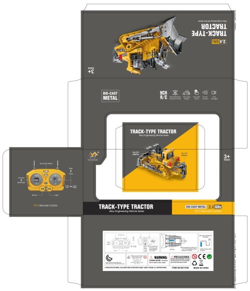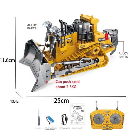 RC buldozér s pásovými kolesami je skvelý model pre všetkých nadšencov do diaľkovo ovládaných stavebných strojov Tento buldozér sa pohybuje vo všetkých smeroch – dopredu, dozadu, doľava a doprava Realistické zvukové a svetelné efekty Predné svetlá svietia a model ponúka niekoľko funkcií pre zábavu - „One click demo“ pre predvádzanie