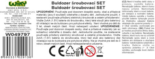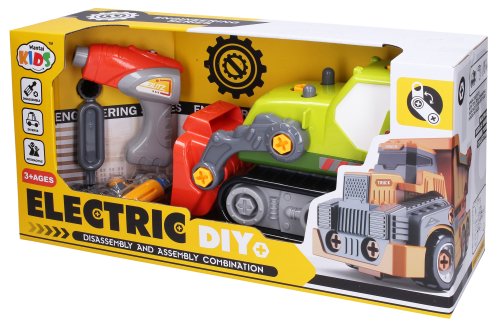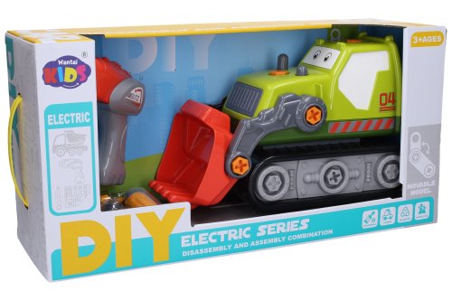 Buldozér skrutkovací s elektrickým skrutkovačom. Obsah balenia - buldozér s elektrickým pohonom (rozmery 30x14x19,5 cm), elektrický skrutkovač, sada kľúčov a skrutkovač s násadami. Elektrickú jednotku skrutkovača je možné vybrať a vložiť do buldozéra. 2xAA batérie do skrutkovača, nie sú súčasťou.