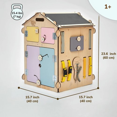 Hrací domček BusyKids je Montessori hračka ideálna pre každé dieťa. Pedagogika Montessori podporuje učenie detí zábavným a prirodzeným spôsobom, rozvíja ich kreativitu, jemnú motoriku a logické myslenie. Ak hľadáte kvalitnú hračku pre batoľa, ktorá ich bude baviť dlhé roky, stane sa jeho spoločníkom a neskôr ju využijú aj súrodenci, potom je hrací domček BusyKids House tou ideálnou voľbou . Domček je vhodný pre deti všetkých vekových kategórií. Batoľatá sa rada schovávajú do domčeka a objavujú jeho priestor, predškoláci trénujú jemnú motoriku, koordináciu ruka-oko a učia sa napríklad zaväzovanie šnúrok. Dospelí ocenia, že majú doma ekologickú alternatívu k plastovým hračkám, ktorá vydrží aj pre ďalšie generácie. Hrací domček ponúka širokú škálu aktivít. Na streche nájdete tabuľu a vkladacie puzzle, na stenách sú zipsy, suchý zips, dotyková lampa, budík, motorické prvky, tlačidlá, okná a dvere. Otváranie, zatváranie a vhadzovanie hračiek dovnútra aj von deti nesmierne bavia. Vďaka interaktívnym prvkom domček podporuje rozvoj kreativity, zmyslového vnímania, logického myslenia a jemnej motoriky. Deti si trénujú koordináciu oko-ruka, sústredenie a trpezlivosť pri zložitejších aktivitách, ako je zapínanie gombíkov a tlačí tek.Každ ý kus domčeka prechádza starostlivou ručnou výrobou. Diely sú vyrobené z kvalitnej brezovej preglejky, laserovo rezané hrany sú hladké a bezpečné pre deti. Použité laky na vodnej báze sú zdravotne nezávadné a konštrukcia je bez skrutiek, všetky prvky sú nitované. Domček je certifikovaný podľa CE, 2009/48/ES a noriem EN 71-1, 71-2, 71-3, 71-8 a 71-9. Farebné odchýlky, uzly či drobné opravy dreva sú prirodzené a dodávajú domčeku jedinečný charakter. Produkt je možné zložiť zo šiestich panelov, takže je vhodný aj do menších priestorov. Hlavné vlastnosti: inšpirácia Montessori pedagogikou obsahuje interaktívne prvky ako zipsy, suchý zips, tlačidlá, budík, puzzle, tabuľa rozvíja jemnú motoriku, kreativitu a logické myslenie vyrobené z kvalitnej brezovej preglejky, bezpečné laky na vodnej báze konštrukcie bez skrutiek, diely bezpečnosti CE a normy EN 71vyrobené v Českej republike