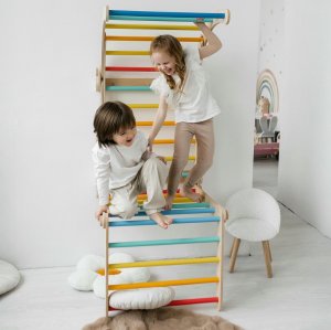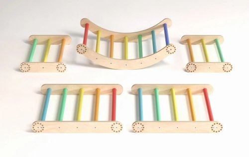Mať vlastný herný park priamo doma to je sen každého dieťaťa. A čo potom rebrinovú horolezeckú stenu s hrazdou na konci! Táto veľká lezecká stena je vhodná pre menšie deti aj pre tie, ktoré už rady zdolávajú výšky. Rebriny sa skladajú z troch prvkov. Dvoch trojuholníkov a jedného balančného oblúka. Veľký trojuholník má rozmery 51,5 x 63,5 x 66 cm (výška × hĺbka × šírka), malý trojuholník 31,5 × 63,5 × 43,5 cm (výška × hĺbka × šírka) a balančný oblúk je s rozmermi 21 × 63,5 × 75 cm. Táto veľká lezecká sada pre deti kombinuje 2 trojuholníky a malú hojdaciu dosku s možnosťou upevnenia na stenu. Zostavu je možné použiť na zemi na plazenie, státie, lezenie a na skúšanie rôznych variácií hry podľa veku a zručností a špeciálne stenové upevnenie potom transformuje tento modul na skutočnú horolezeckú stenu, ktorá je ideálna pre rozvoj motorických zručností. Vďaka variabilnému dizajnu bude táto sada rásť spolu s dieťaťom, od plazenia a lezenia až po náročnejšie horolezecké vý zvy. Produkt je vyrobený z kvalitnej brezovej preglejky, farebné odchýlky, hrče či drobné opravy v dreve sú prirodzené a dodávajú výrobku jedinečný charakter . stolček ek. Hlavné vlastnosti: multifunkčné využitie nosnosť 100 kg vzdialenosť medzi priečkami je 8,5 cm trénuje motoriku a rovnováhu skvelý doplnok do detskej izby či herne
