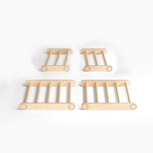 Mať vlastný herný park priamo doma to je sen každého dieťaťa. Táto malá lezecká sada ponúka mnoho variantov zostavenia, ktoré ľahko zmeníte bez použitia náradia. Je vhodná pre menšie deti aj pre tie, ktoré už rady zdolávajú výšky. Zostava sa skladá z dvoch trojuholníka. Veľký trojuholník má rozmery 51,5 x 63,5 x 66 cm (výška × hĺbka × šírka) a malý trojuholník je s rozmermi 31,5 × 63,5 × 43,5 cm (výška × hĺbka × šírka). Produkt je vyrobený z kvalitnej brezovej preglejky; farebné odchýlky, hrče či drobné opravy v dreve sú prirodzené a dodávajú výrobku jedinečný charakter. Hlavné vlastnosti: multifunkčné využitie nosnosť 80 kg vzdialenosť medzi priečkami je 8,5 cm trénuje motoriku a rovnováhu skvelý doplnok do detskej izby či herne