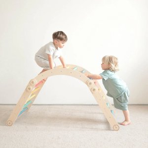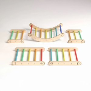 Mať vlastný herný park priamo doma to je sen každého dieťaťa. Táto veľká lezecká sada ponúka desiatky variantov zostavenia, ktoré ľahko zmeníte bez použitia náradia. Je vhodná pre menšie deti aj pre tie, ktoré už rady zdolávajú výšky. Vďaka kombinácii prírodného dreva a nádherných dúhových farieb sa stane atraktívnou súčasťou detskej izby alebo herne. Zostava sa skladá z troch prvkov. Dvoch trojuholníkov a jedného balančného oblúka. Veľký trojuholník má rozmery 51,5 x 63,5 x 66 cm (výška × hĺbka × šírka), malý trojuholník 31,5 × 63,5 × 43,5 cm (výška × hĺbka × šírka) a balančný oblúk je s rozmermi 21 × 63,5 × 75 cm. Produkt je vyrobený z kvalitnej brezovej preglejky; farebné odchýlky, hrče či drobné opravy v dreve sú prirodzené a dodávajú výrobku jedinečný charakter. Hlavné vlastnosti: multifunkčné využitie nosnosť 80 kg vzdialenosť medzi priečkami je 8,5 cm trénuje motoriku a rovnováhu skvelý doplnok do detskej izby či herne