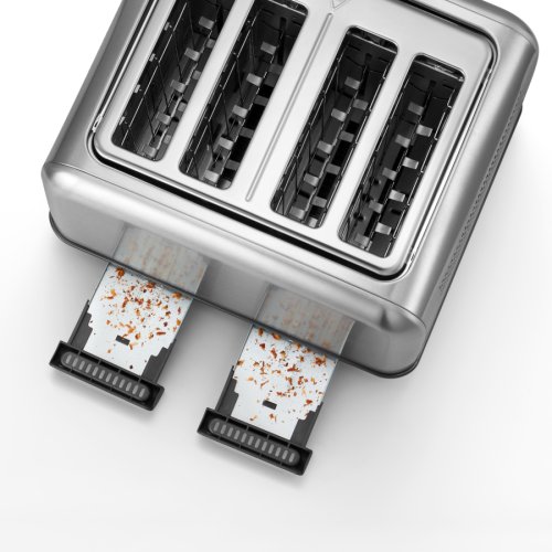 Rýchle varenie so zdvíhacou spínacou pákou pre ľahký prístup, s vyberateľnou miskou na omrvinky pre ľahké čistenie a skrytím proti prachu, s úložným priestorom pre kábel v spodnej časti.
